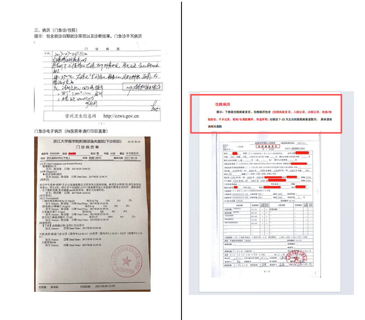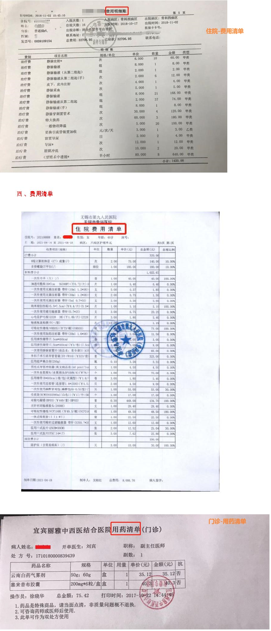 5、二、三级公立医院开具的病历(病历内涵盖所有就诊内容的复印件)检查/检验报告单、费用清单医疗费用发票原件(如住院需住院病历),如无法提供原件需提供全套就诊材料复印件及第三方赔付结算单原件,或者有法院盖章的复印件。