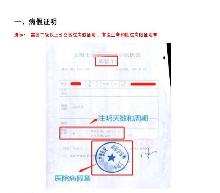 1、医生开具的病假单原件(需二级或二级以上医院盖章)