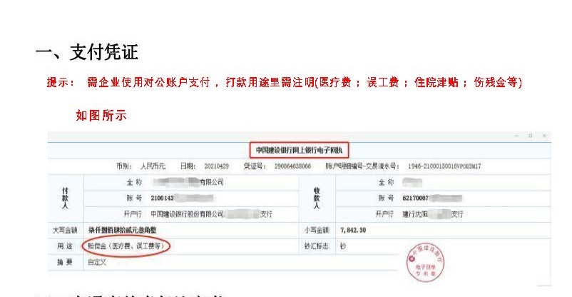1、交通事故需提供事故责任认定书与和解协议并附上支付凭证(如员工驾车受伤,需提供员工驾驶证及行驶证件)均盖公章。